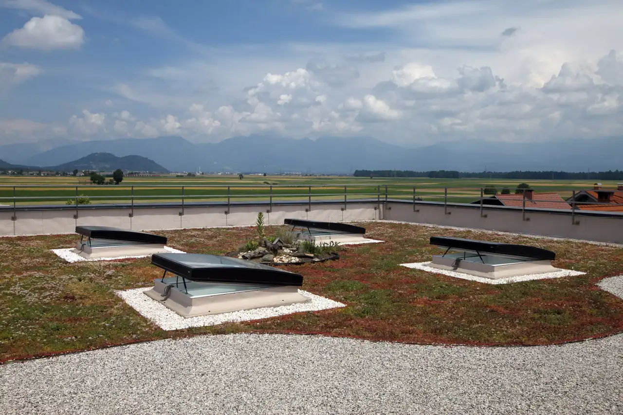 Kontrollieren Sie Ihr Flachdach daher regelmäßig. Schmutz und Laub beeinträchtigen nicht nur die Sicht und den Lichteinfall durch Ihre Dachfenster im Flachdach, sondern stören schlimmstenfalls den ordnungsgemäßen Ablauf der Niederschlagsmengen. Aufgrund starker Niederschläge ist zudem – außer bei Dächern mit intensiver Dachbegrünung – immer ein Notentwässerungssystem für Flachdächer vorgeschrieben.
